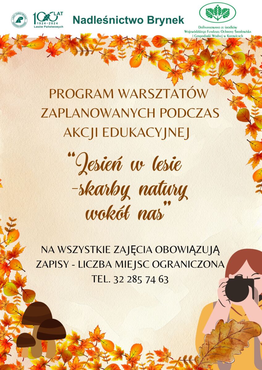 Nadleśnictwo Brynek serdecznie wszystkich do udziału w cyklu jesiennych warsztatów edukacyjnych i artystycznych organizowanych w ramach akcji „Jesień w lesie – Skarby natury wokół nas” dofinansowanej z Wojewódzkiego Funduszu Ochrony Środowiska i Gospodarki Wodnej w Katowicach.