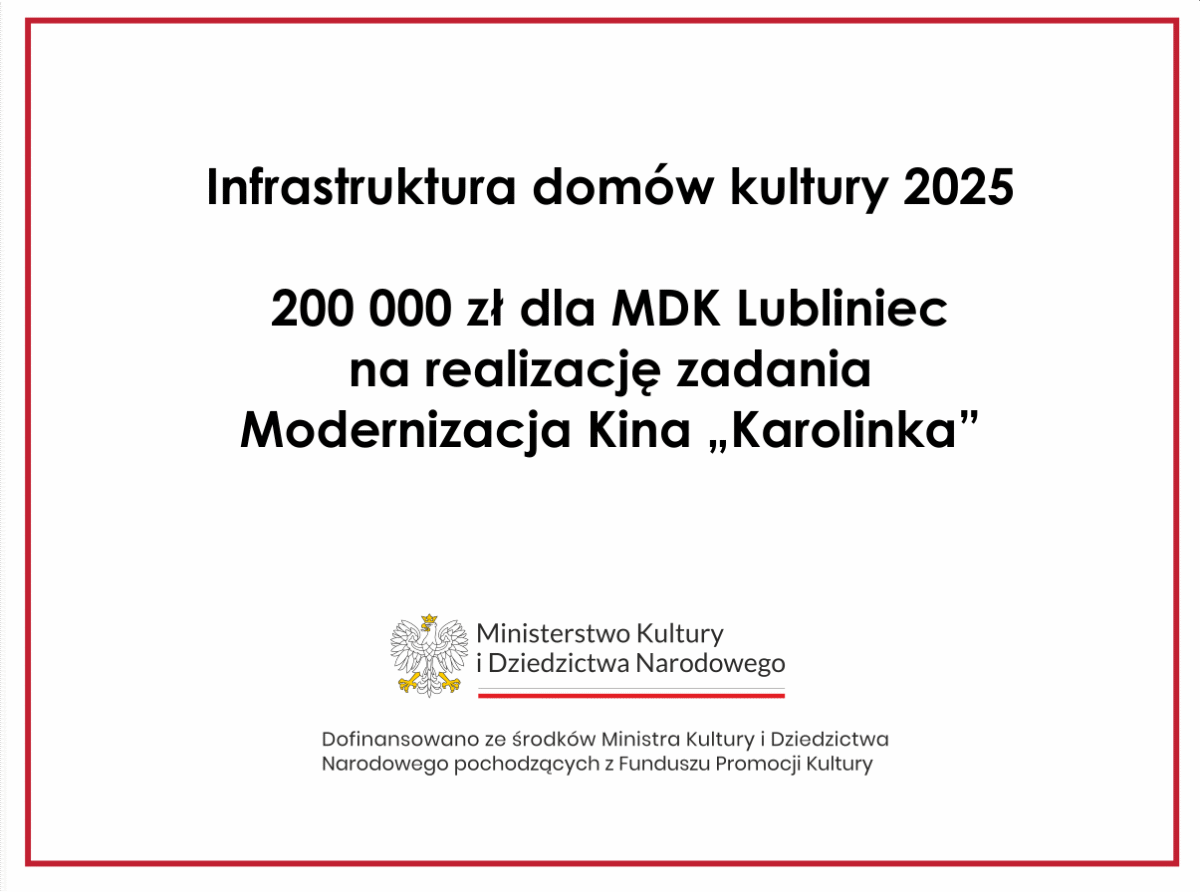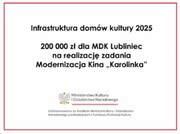 W ramach zadania Miejski Dom Kultury w Lublińcu zakupi nowy projektor kinowy do Kina „Karolinka”.