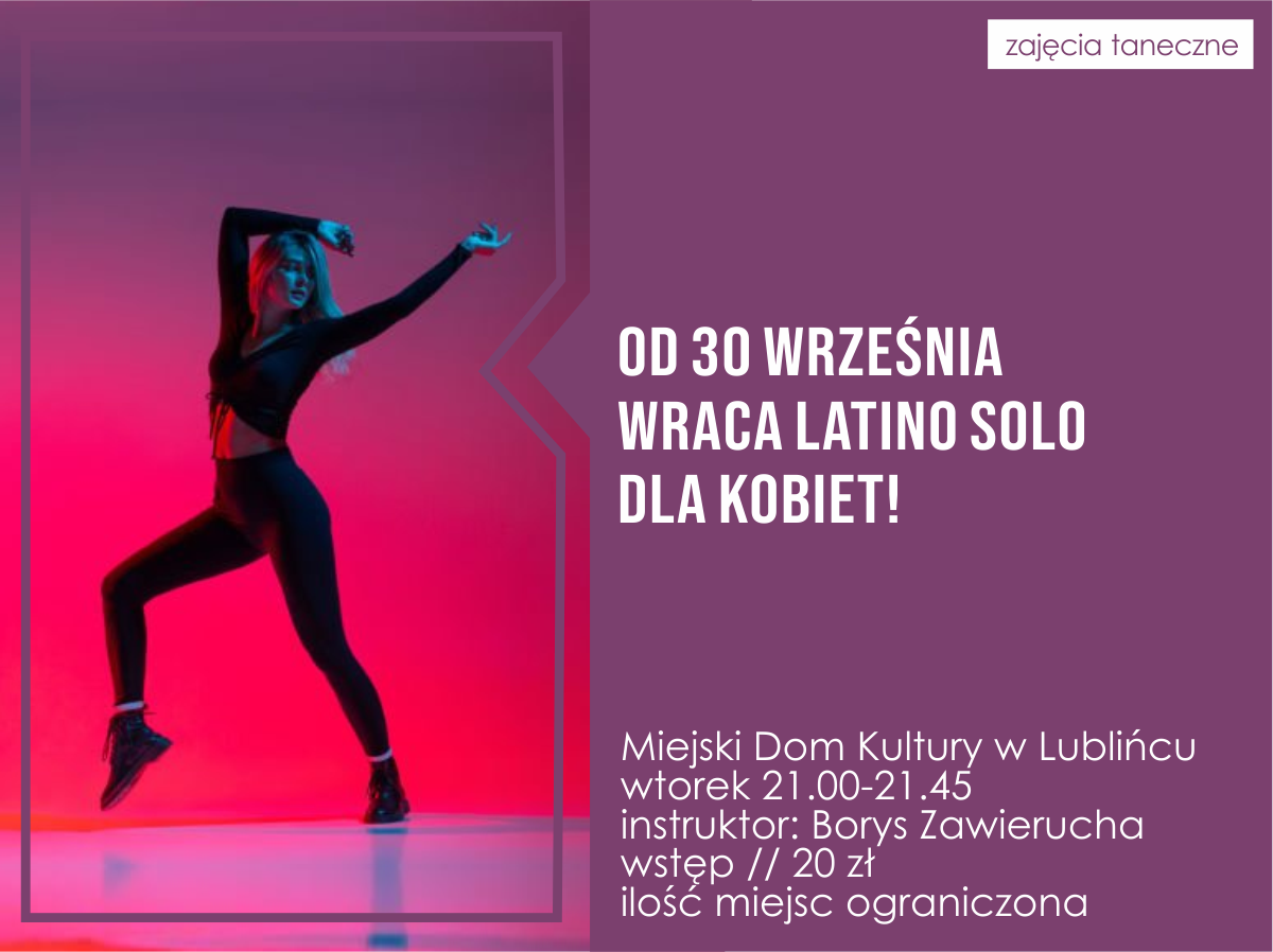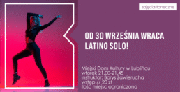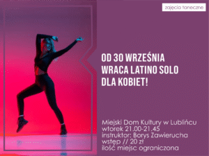 Latino solo powraca! Zajęcia odbywać się będą w każdy wtorek w godzinach 21:00-21:45 w sali baletowej Miejskiego Domu Kultury w Lublińcu. Zajęcia prowadzi instruktor Borys Zawierucha.