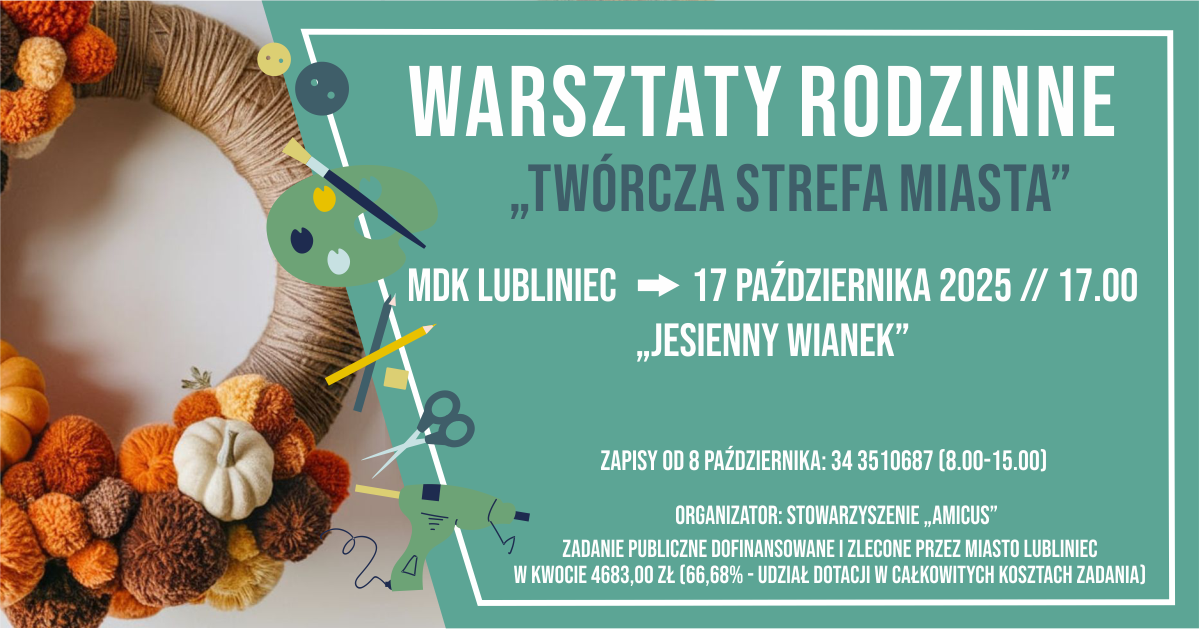 Zapraszamy serdecznie na rodzinne warsztaty ,,Jesienny wianek”, które odbędą się 17 października 2025 roku o godzinie 17:00. Udział w warsztatach jest bezpłatny, obowiązują zapisy. Zapisać można się od 8 października w godzinach 8:00 – 15:00 pod numerem telefonu 34/351 06 87.