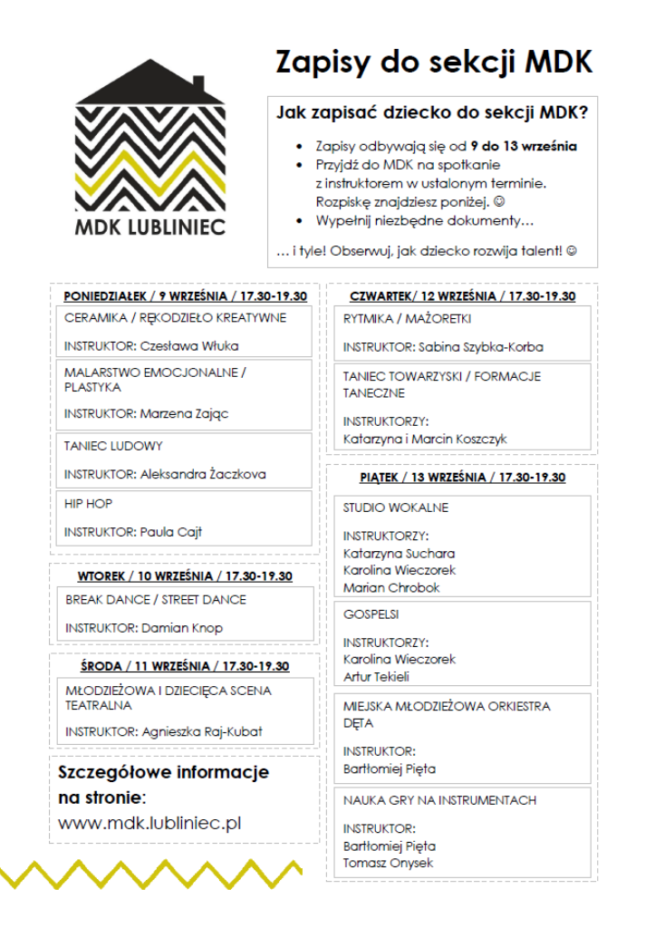 Ruszają zapisy do sekcji MDK! Przypominamy, że aby zapisać dziecko na zajęcia, należy przyjść osobiście do MDK w dzień, w którym będzie instruktor sekcji.