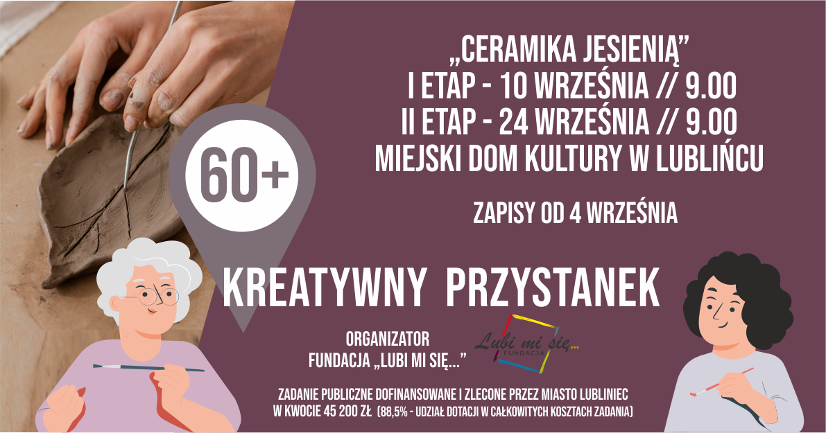 4 września 2025 ruszają zapisy na spotkania pod hasłem ,,Ceramika jesienią”, które odbędą się w terminie 10 września 2025 roku o godzinie 9:00 oraz 24 września 2025 roku o godzinie 9:00 w Miejskim Domu Kultury w Lublińcu.