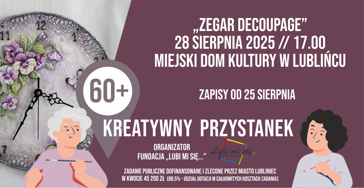 25 sierpnia 2025 roku o godzinie 15:00 ruszają zapisy na twórcze spotkanie pod hasłem ,,Zegar decoupage” odbędzie się w terminie 28 sierpnia 2025 roku o godzinie 17:00 w Miejskim Domu Kultury w Lublińcu.