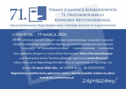 Dzień dobry, informujemy o terminie eliminacji konkursowych 71. Ogólnopolskiego Konkursu Recytatorskiego organizowanego przez Regionalny Ośrodek Kultury w Częstochowie