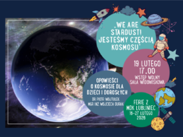 19 lutego 2026 roku o godzinie 17:00 spotkanie ,,We are stardust! Jesteśmy częścią kosmosu” – czyli opowieści o kosmosie dla dzieci i dorosłych, spotkanie poprowadzą pracownicy Uniwersytetu Wrocławskiego doktor Piotr Wojtulek i magister inżynier Wojciech Durak