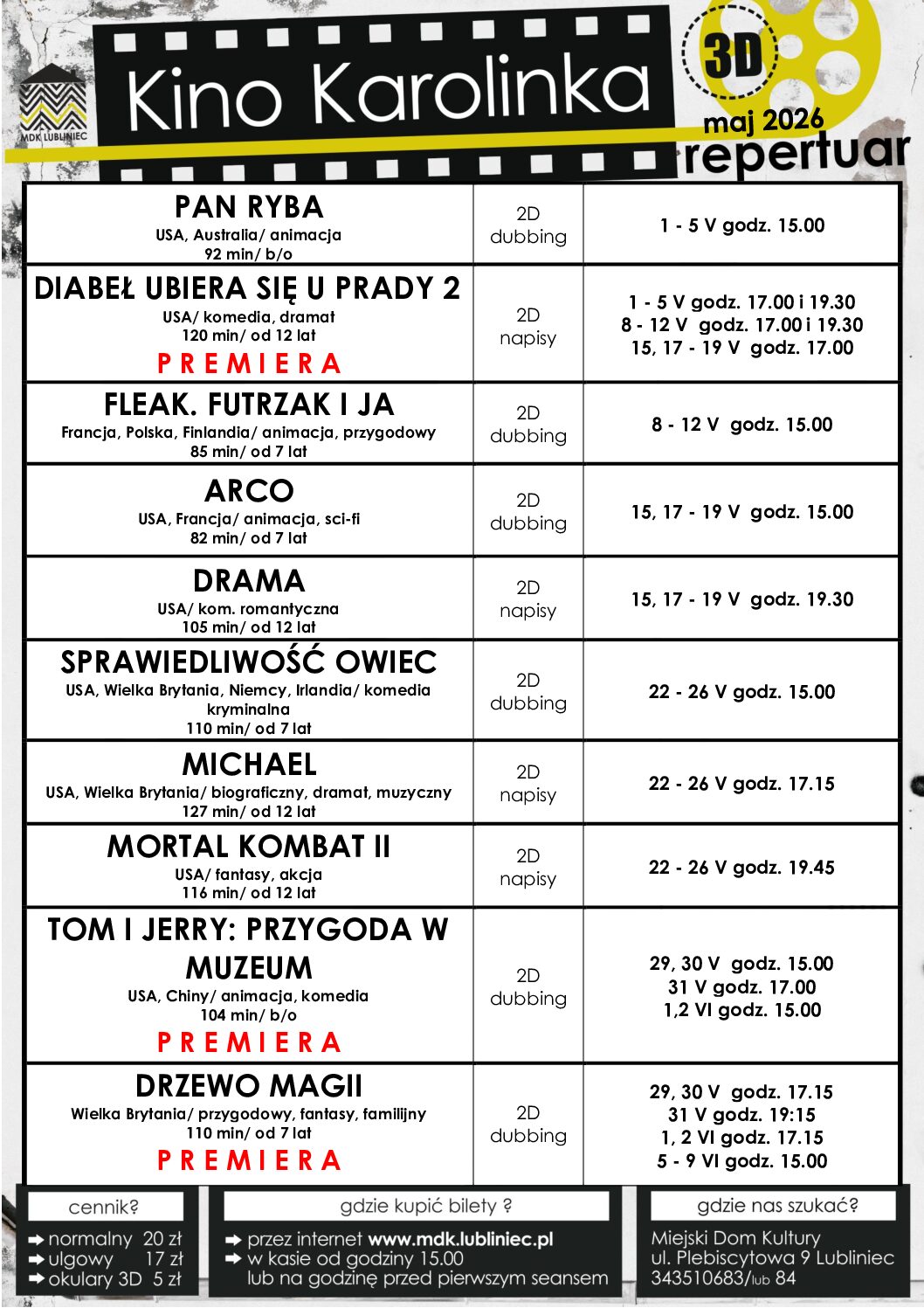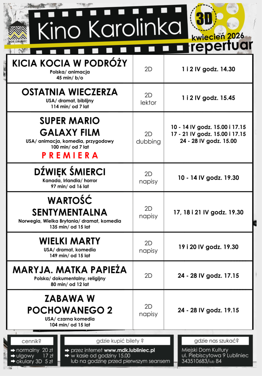 01kwiecień14:3028(kwiecień 28)22:00Repertuar Kina ,,Karolinka” – Kwiecień 2026