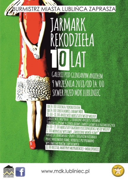 Serdecznie zapraszamy na IV Jarmark Rękodzieła, który odbędzie się 9 września 2018 roku o godz. 14:00 na skwerze przed Miejskim Domem Kultury w Lublińcu. Tego dnia będziemy również świętować 10-lecie Galerii pod Glinianym Aniołem. Z tej okazji przygotowaliśmy dla Państwa moc atrakcji.