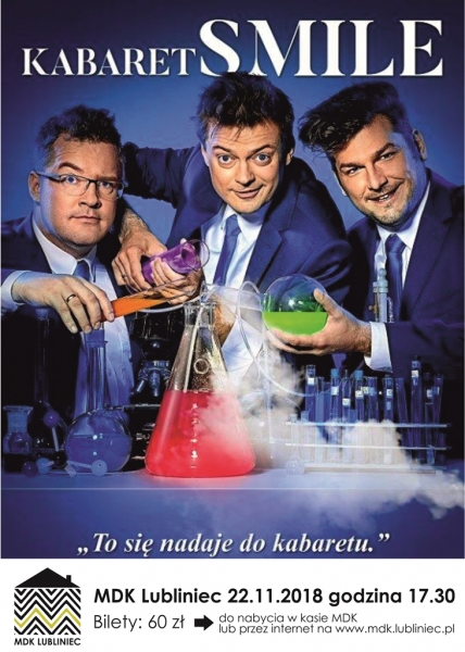 Miejski Dom Kultury w Lublińcu zaprasza 22 listopada 2018 roku o godz. 17:30 i 20:30 na występ Kabaretu Smile w najnowszym programie "To się nadaje do kabaretu".
