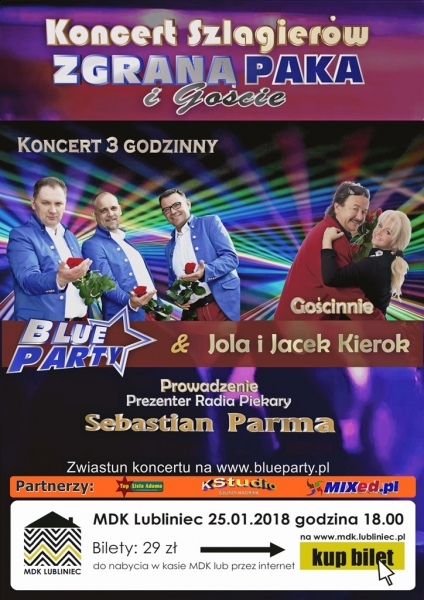 Miejski Dom Kultury w Lublińcu zaprasza na koncert "Zgrana Paka i Goście", który odbędzie się 25 stycznia 2018 roku godz. 18:00. Jest to sceniczna wersja rozrywkowego programu emitowanego jakiś czas temu w Radio Piekary prowadzonego przez