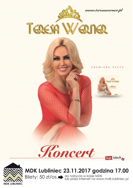 Miejski Dom Kultury w Lublińcu zaprasza na koncert Teresy Werner w dniu 23 listopada 2017 roku o godz. 17:00.