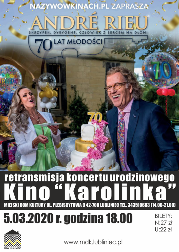 Retransmisja koncertu urodzinowego André Rieu w lublinieckim Kinie „Karolinka” odbędzie się 27 lutego 2020 o godzinie 18.00. Bilety dostępne w kasie kina (od godz. 15.00) i na stronie www.bilety.mdk.lubliniec.pl w cenie 27 zł (bilet normalny) i 22 zł (bilet ulgowy).