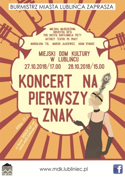 Burmistrz Miasta Lublińca i Dyrektor Miejskiego Dom Kultury w Lublińcu zapraszają na koncert pt. „Na pierwszy znak”, który odbędzie się 27.10.2018 roku o godz. 17:00 i 28.10.2018 roku o godz. 15:00 w MDK.