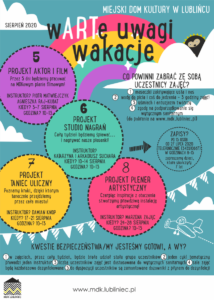 W trakcie „Wakacji wARTych uwagi”  dzieci (od 7. roku życia) pracują nad jednym, konkretnym tematem przez cały tydzień. Efektem działań jest konkretny projekt artystyczny – film, piosenki, układ taneczny instalacja artystyczna. Prace będą odbywają się od poniedziałku do piątku w godzinach 10.00-13.00.