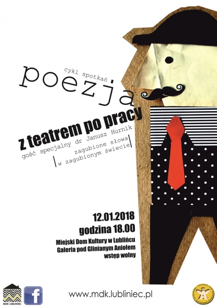 Miejski Dom Kultury zaprasza na kolejne spotkanie z poezją z Teatrem po pracy, które odbędzie się 12 stycznia 2018 roku godz. 18:00 w Galerii pod Glinianym Aniołem. Wstęp wolny.