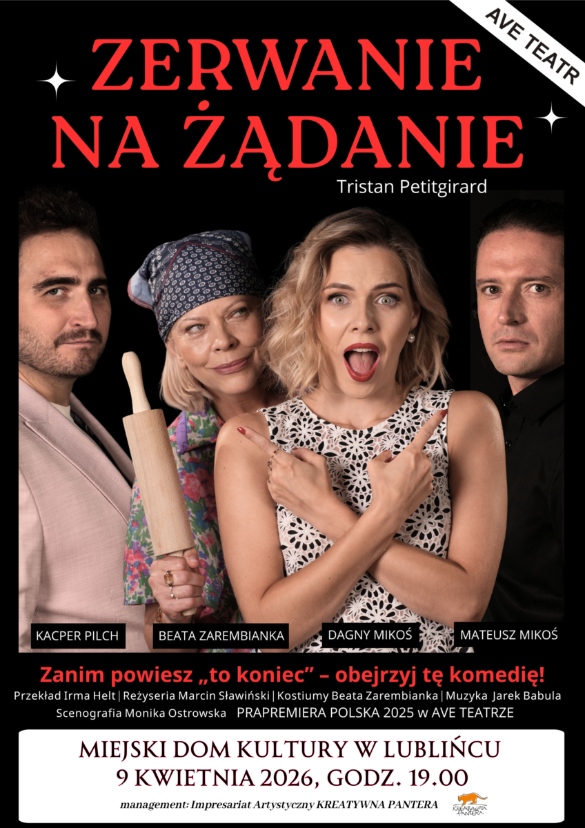 Już 9 kwietnia o godzinie 19:00 na scenie wystąpi Ave Teatr z genialnym spektaklem komediowym „Zerwanie na żądanie”. To propozycja dla tych, którzy cenią sobie błyskotliwy humor i świetną grę aktorską. To idealny sposób na spędzenie wiosennego wieczoru w doborowym towarzystwie. Bilety w cenie 110 zł do kupienia w kasie MDK oraz online. Jest również możliwość zakupu miejsca na dostawce w cenie 59 zł (dostępne wyłącznie w kasie MDK).