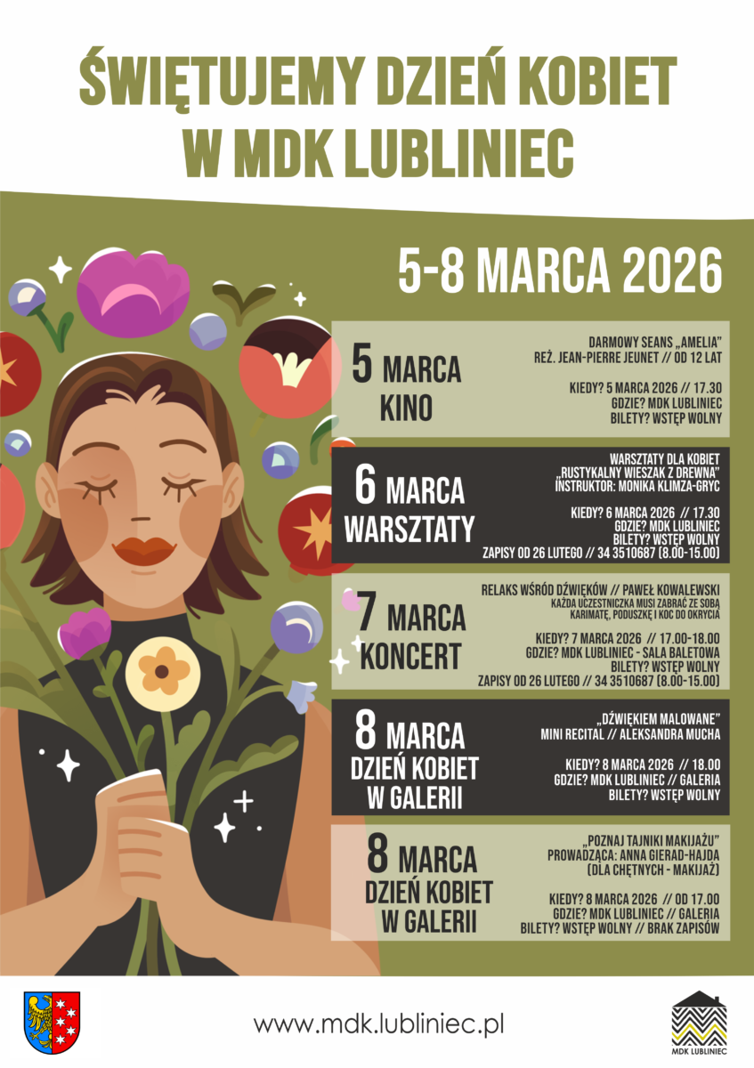 W dniach 5–8 marca 2026 roku Miejski Dom Kultury w Lublińcu zaprasza do wspólnego świętowania Dnia Kobiet. Tegoroczny program to cztery dni wypełnione filmem, warsztatami, muzyką i spotkaniami, które pozwolą zatrzymać się na chwilę, zadbać o siebie i spędzić czas w inspirującym kobiecym gronie.