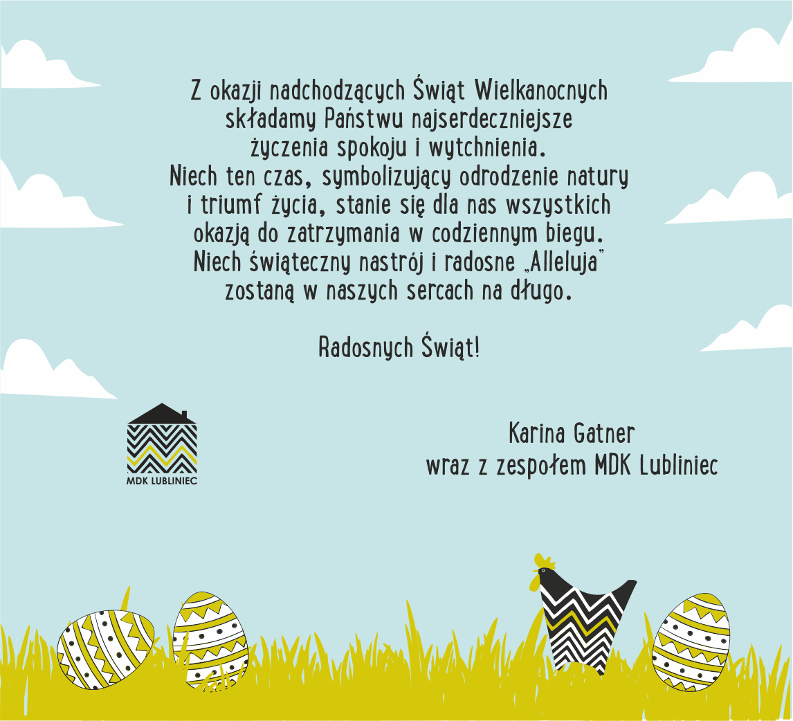 Z okazji nadchodzących Świąt Wielkanocnych składamy Państwu najserdeczniejsze życzenia spokoju i wytchnienia.